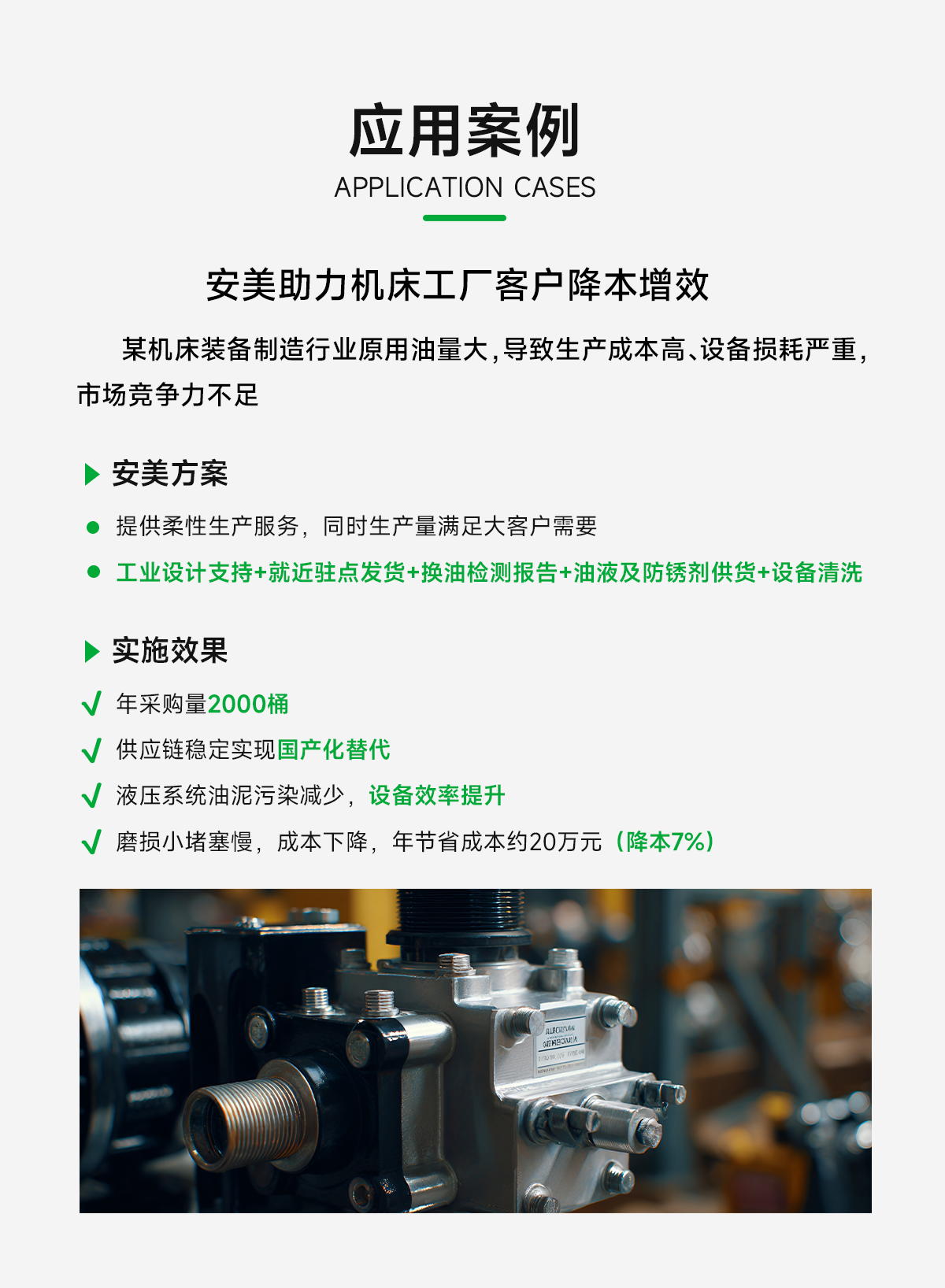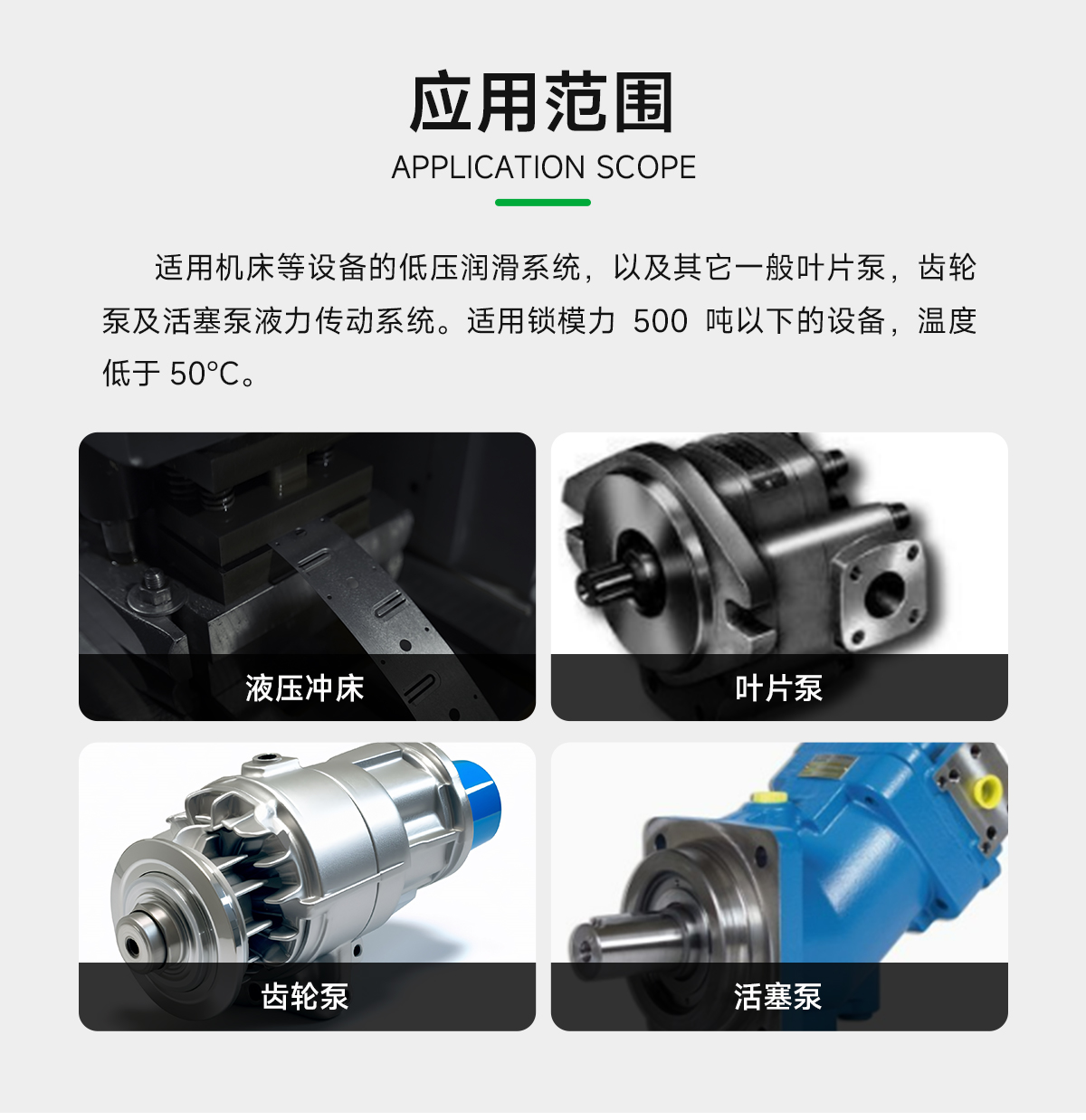 安美優(yōu)質(zhì)液壓油LAW適用機(jī)床等設(shè)備的低壓潤(rùn)滑系統(tǒng),以及其它一般葉片泵,齒輪泵及活塞泵液力傳動(dòng)系統(tǒng)。