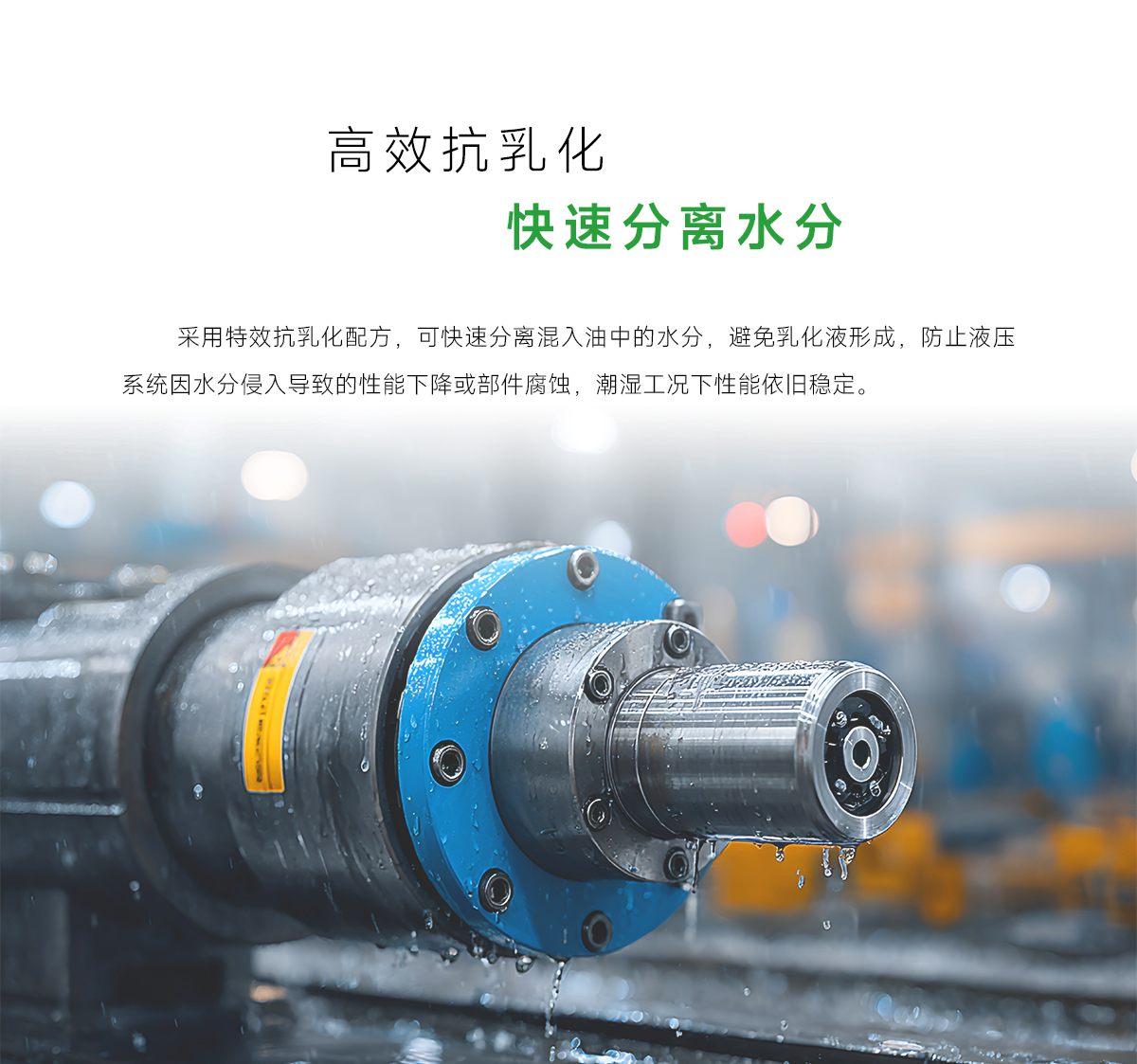 1、優(yōu)良的抗乳化性:特效添加劑配方,使得本品具有快速分離水分的特性,適用于有可能進(jìn)水的液壓系統(tǒng)的潤(rùn)滑。