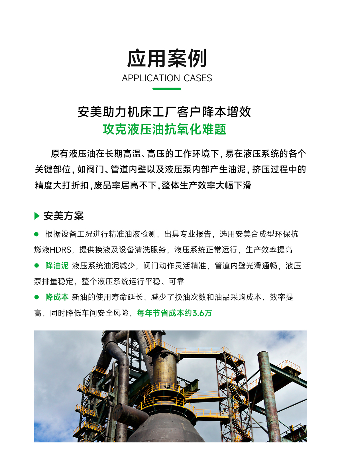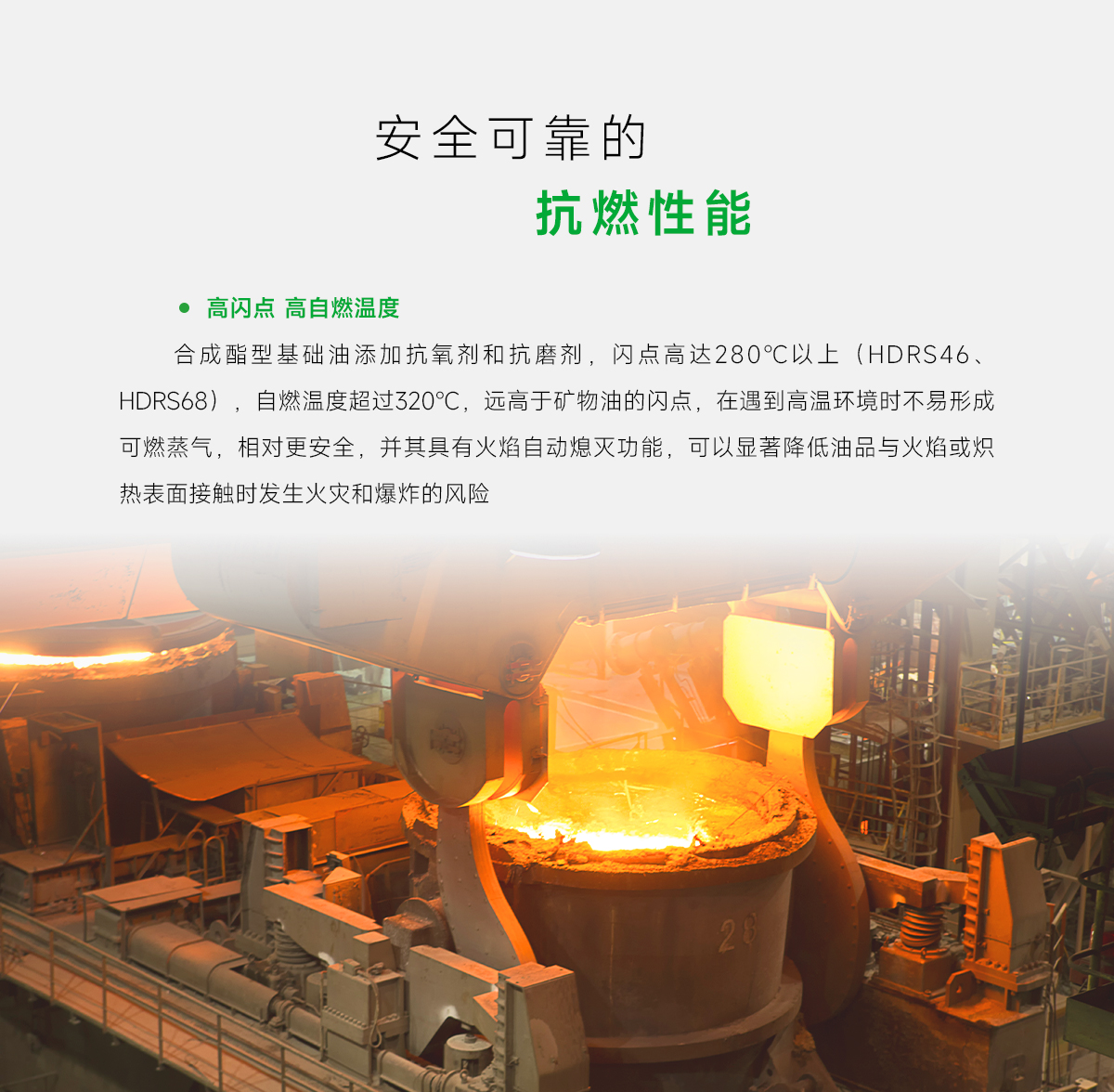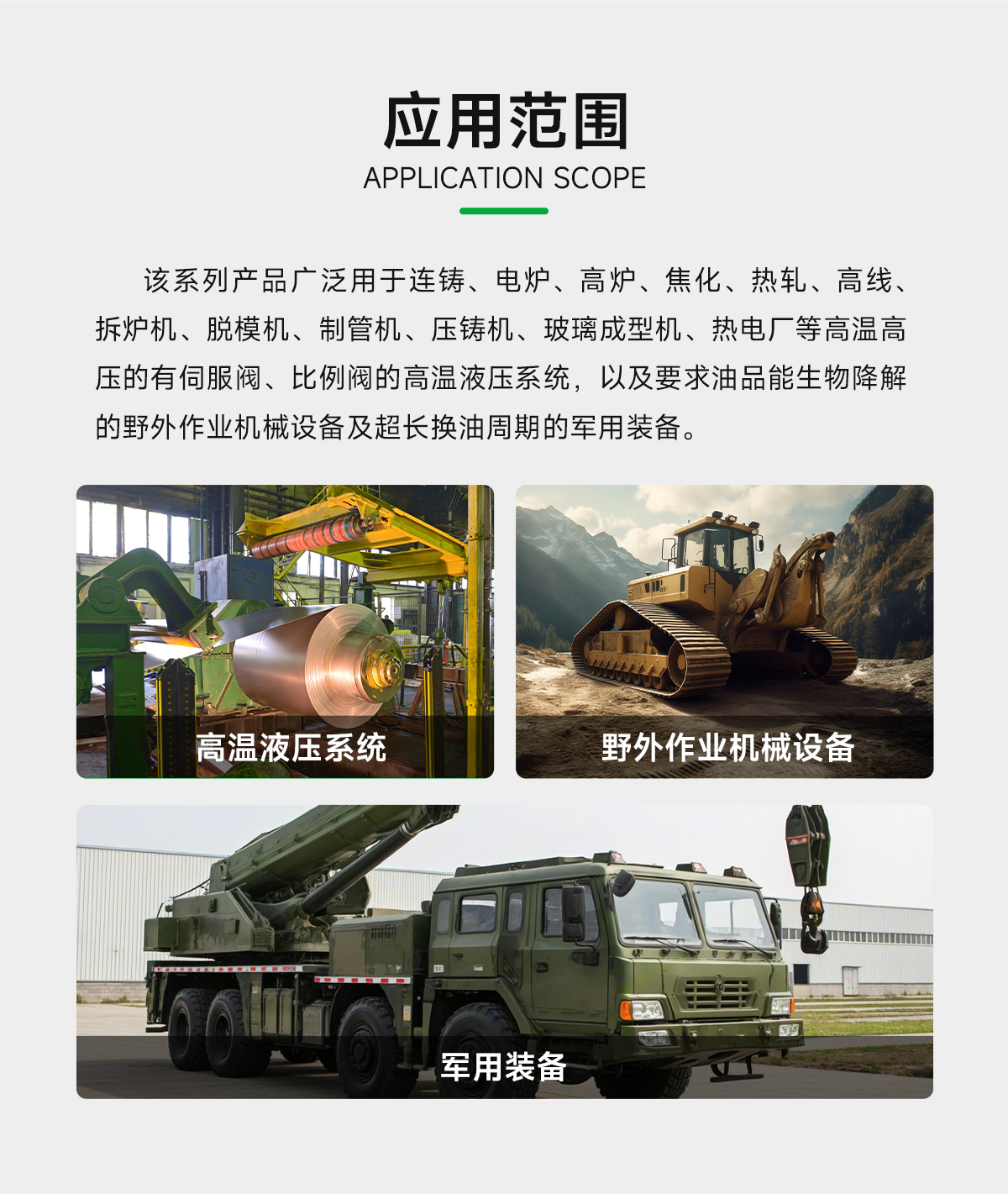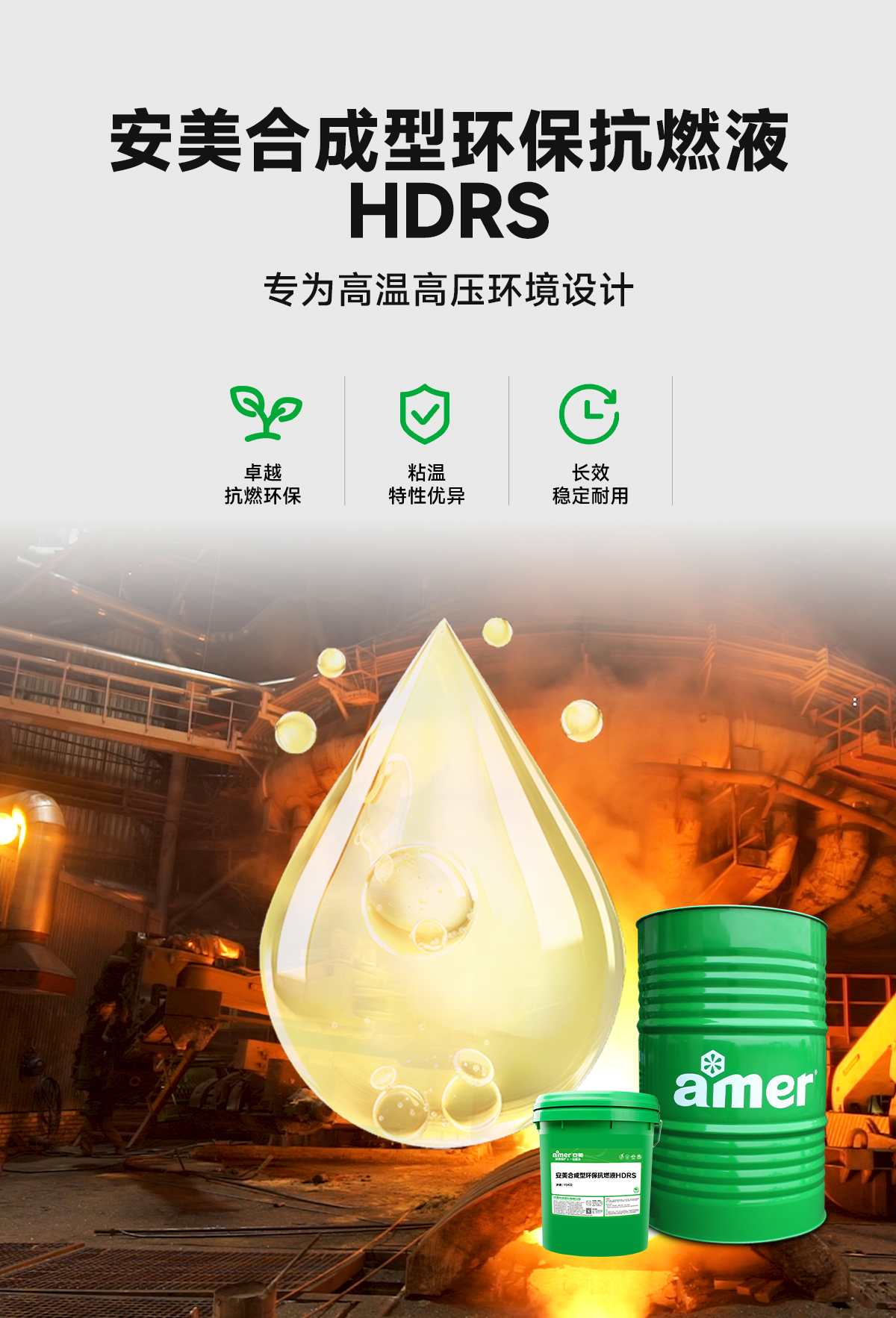 安美合成型環(huán)保抗燃液HDRS廣泛用于連鑄、電爐、高爐、焦化、熱軋、高線、拆爐機(jī)、脫模機(jī)、制管機(jī)、壓鑄機(jī)、玻璃成型機(jī)、熱電廠等高溫高壓的有伺服閥、比例閥的高溫液壓系統(tǒng),以及要求油品能生物降解的野外作業(yè)機(jī)械設(shè)備及超長換油周期的軍用裝備。