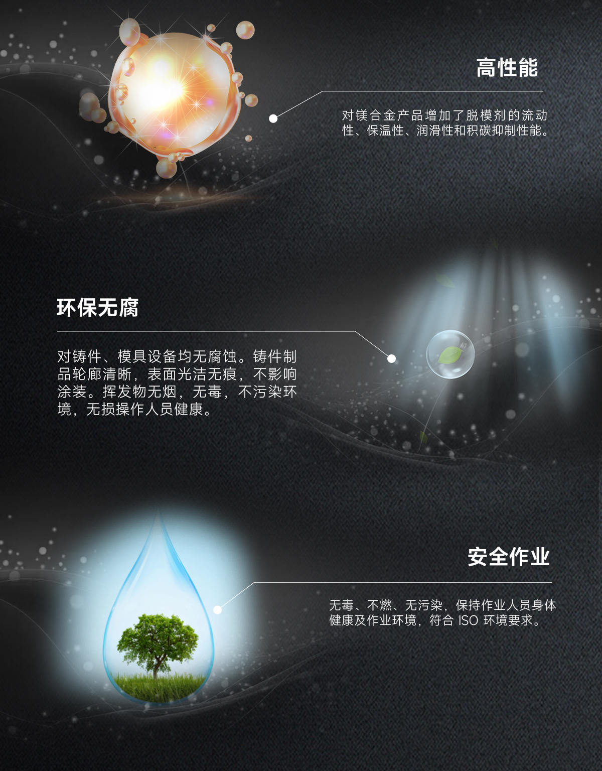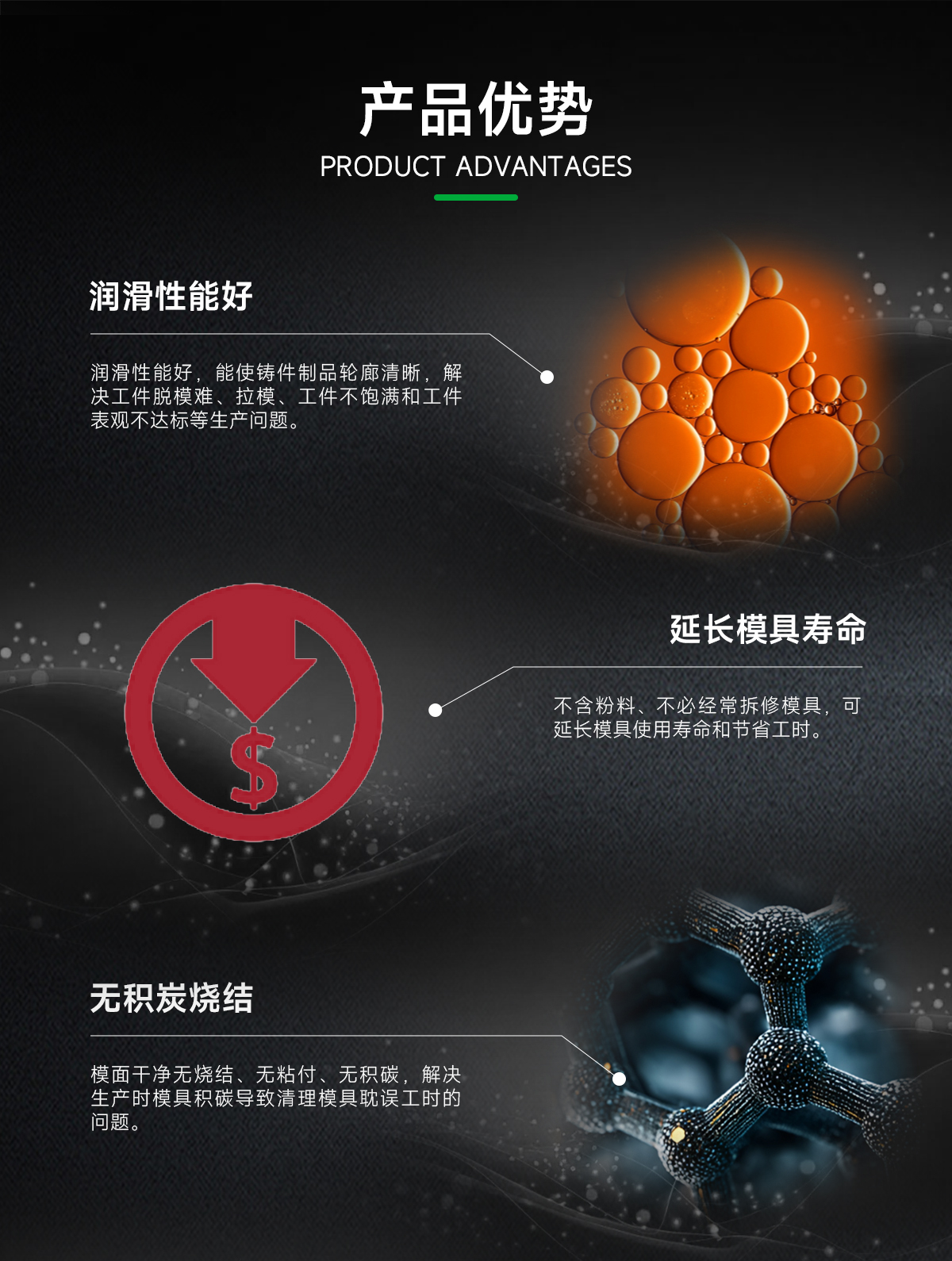 4、對(duì)鎂合金產(chǎn)品增加了脫模劑的流動(dòng)性、保溫性、潤滑性和積碳抑制性能。