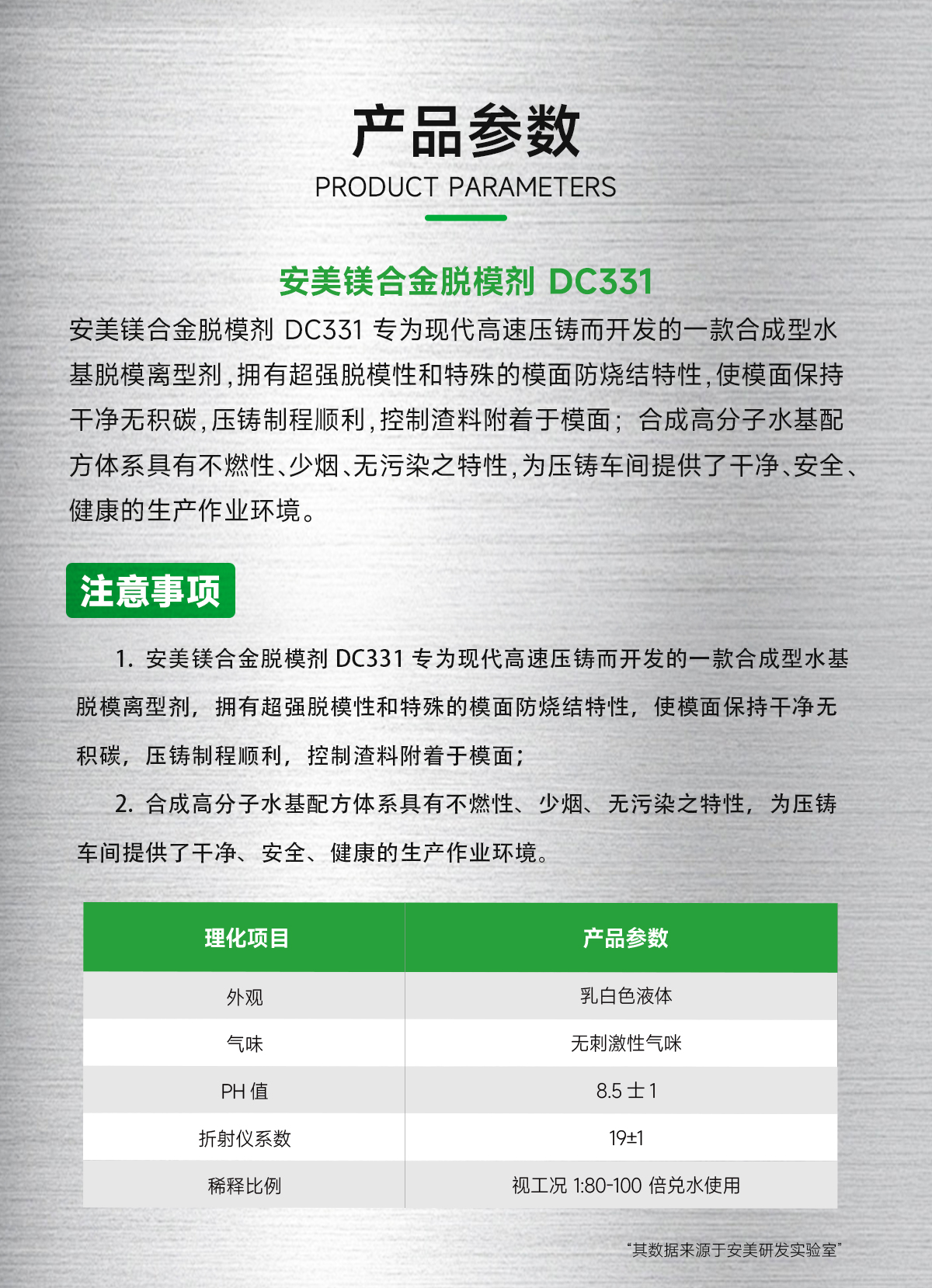 關(guān)于安美鎂合金脫模劑DC331的其它具體指標(biāo)參數(shù),請(qǐng)移步”安美商城”下載MSDS和TDS報(bào)告瀏覽,或直接脫模劑生產(chǎn)廠家—安美集團(tuán)客服熱線400-7788-123/客服微信18576991625查詢索取。