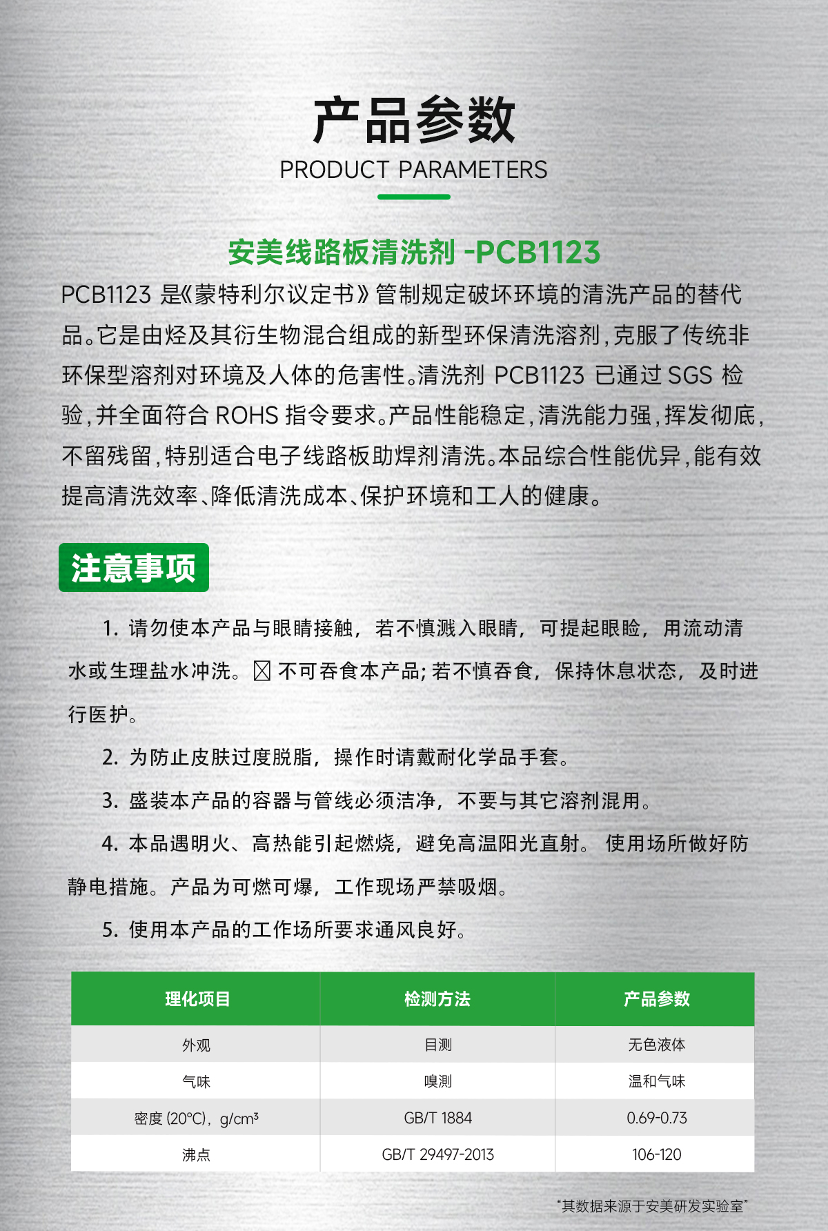 關(guān)于安美線路板專用碳?xì)淝逑磩㏄CB1123的其它具體指標(biāo)參數(shù),請移步”安美商城”下載MSDS和TDS報(bào)告瀏覽,或直接清洗劑生產(chǎn)廠家—安美集團(tuán)客服熱線400-7788-123/客服微信18576991625查詢索取。